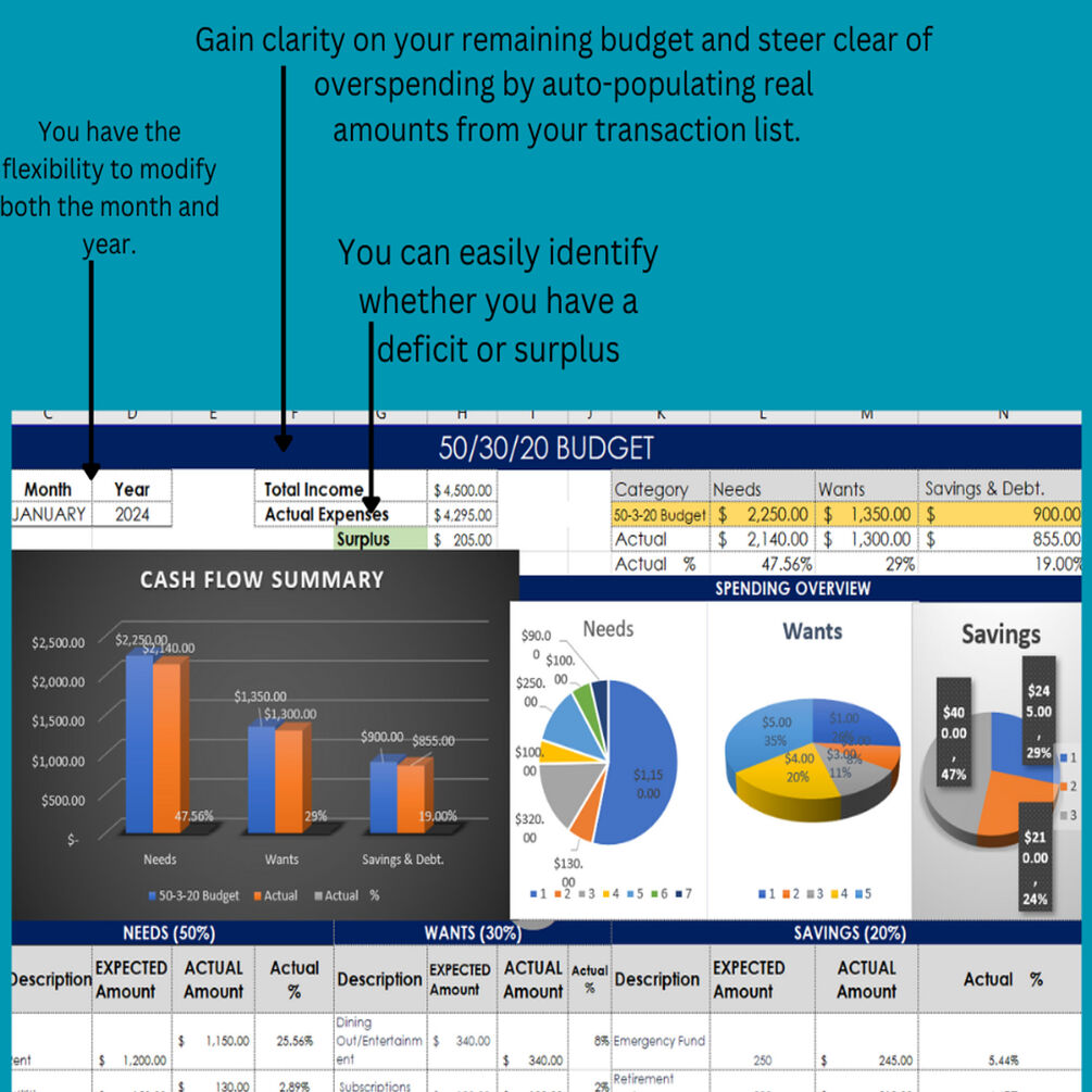 Embark on a journey of financial intentionality with our Monthly 50/30/20 Budget spreadsheet! Tailored for simplicity and effectiveness, this tool uses the highly recommended 50/30/20 budgeting method. Allocate your income wisely to Needs (50%), Wants (30%), and Savings & Debt (20%) effortlessly. This visually appealing, user-friendly spreadsheet includes only the essentials. Just input your transactions, and watch as everything is calculated automatically. Jumpstart your personal finance success – start budgeting smart today.
