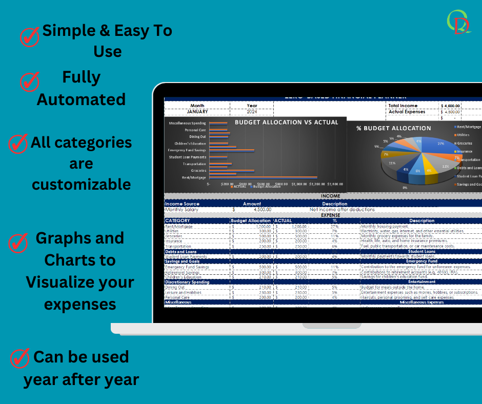 Optimize your financial management effortlessly! Our meticulously crafted Zero-Based Monthly Financial Budget Planner for Microsoft Excel and Google Sheets empowers you to allocate every dollar of your income strategically. Take charge of your finances, track expenses, and achieve financial success. Download our user-friendly template, compatible with Microsoft Excel and Google Sheets, and embark on a journey to financial freedom. Start budgeting smarter today and watch your financial goals become a reality